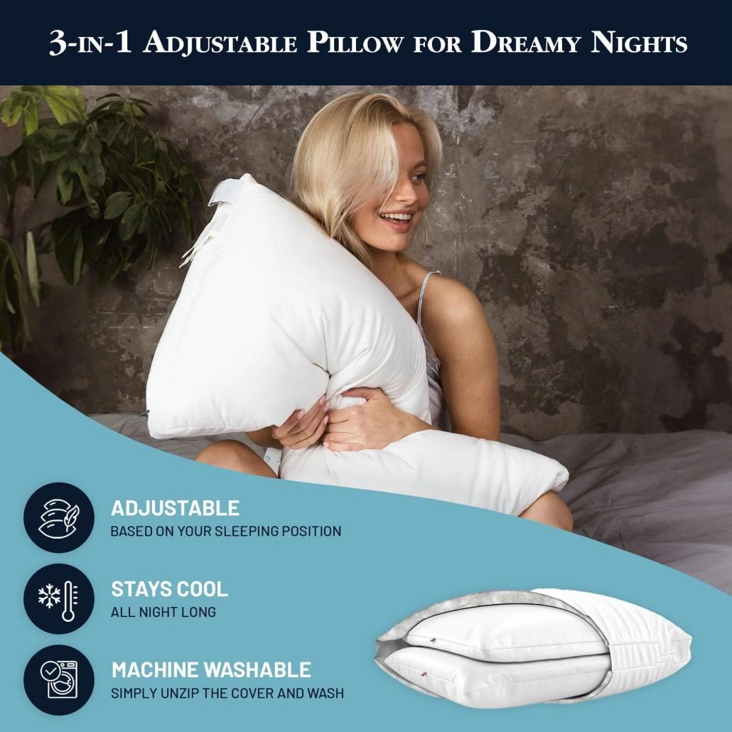 The pillow comfortable with adjustable firmness options and appreciate its quality construction, noting it feels like a quality down pillow and holds up well over time