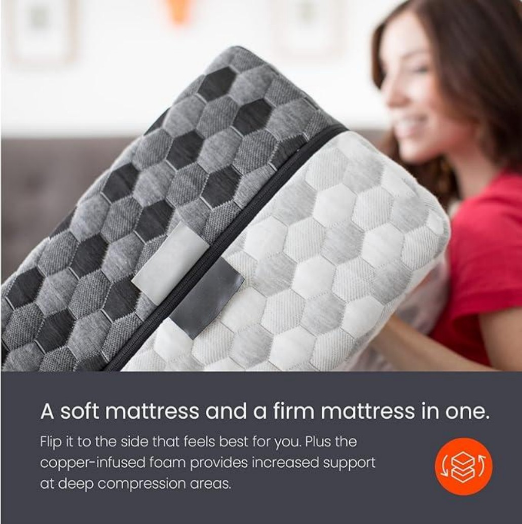 1.Flippable Firmness: The Layla Memory Foam Mattress is firm on one side and soft on the other, so you have two chances to find the right feel for you. If your firmness preferences change over time or if you’re sleeping with a partner who wants a different feel, just flip the mattress to the other side and see if that suits you. Layla was one of the first makers of a flippable copper infused memory foam mattress, so we’ve had years of experience and time to perfect this technology.