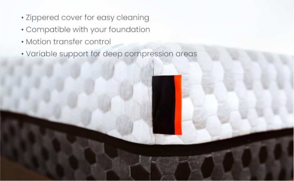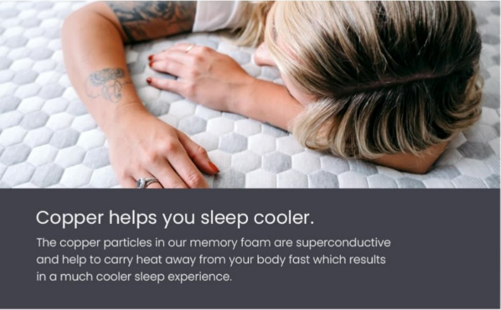 3.Copper Supports: Those copper-gel particles in the memory foam do a lot more than just keep you sleeping super cool, they adapt to your body weight to support you in all the right places. When the copper gel particles in the mattress condense under body weight, they react with a firming response. The more weight that presses down, the more the copper particles push back. So you get more support where your body pushes into the mattress and more give where your body does not.