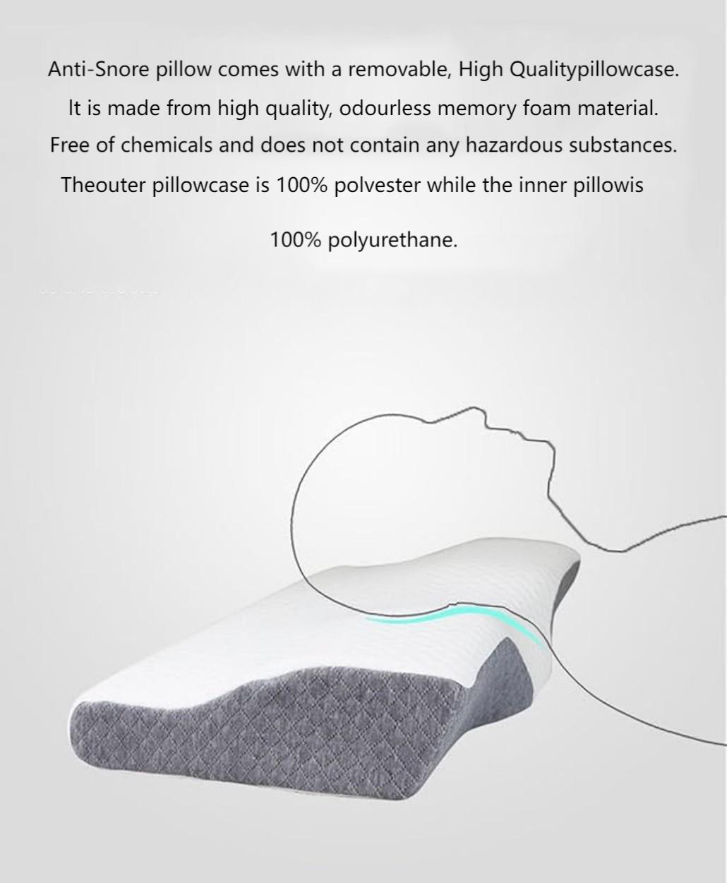 Anti-Snore pillow comes with a removable, High Qualitypillowcase.lt is made from high quality, odourless memory foam material.Free of chemicals and does not contain any hazardous substances.Theouter pillowcase is 100% polvester while the inner pillowis 100% polyurethane.