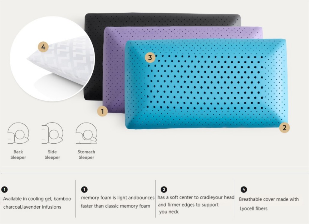 Three technologies come together to make a comfortable, supportive pillow. It starts with dough memory foam, a supple memory foam formula that compresses evenly beneath weight and hugs body curves for personalized comfort. This memory foam is infused with gel material that helps to distribute heat to prevent heat buildup.The pillow with larger holes in the middle to cradle the head and smaller holes around the perimeter to support the neck. This design also improves airflow through the pillow for more breathability.