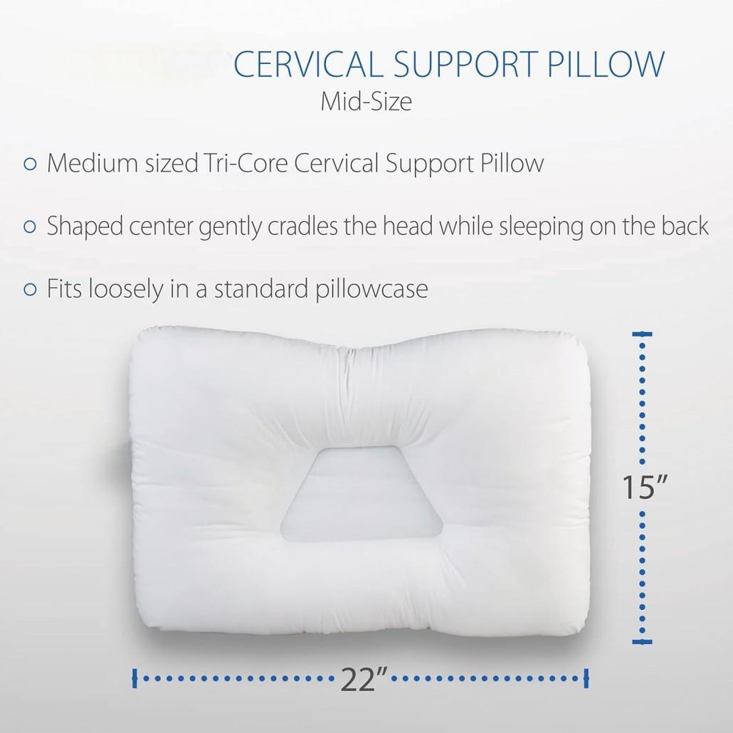 5.Size/Material/Origins/Use: Midsize Gentle, White 23 inches x 15 inches; Assembled in the USA of Globally Sourced Materials; No latex; Fits a standard size pillowcase; You may need time to adjust to the pillow over several weeks, immediate overuse may increase neck pain; Alternate between Tri-Core and current pillow while your body adjusts