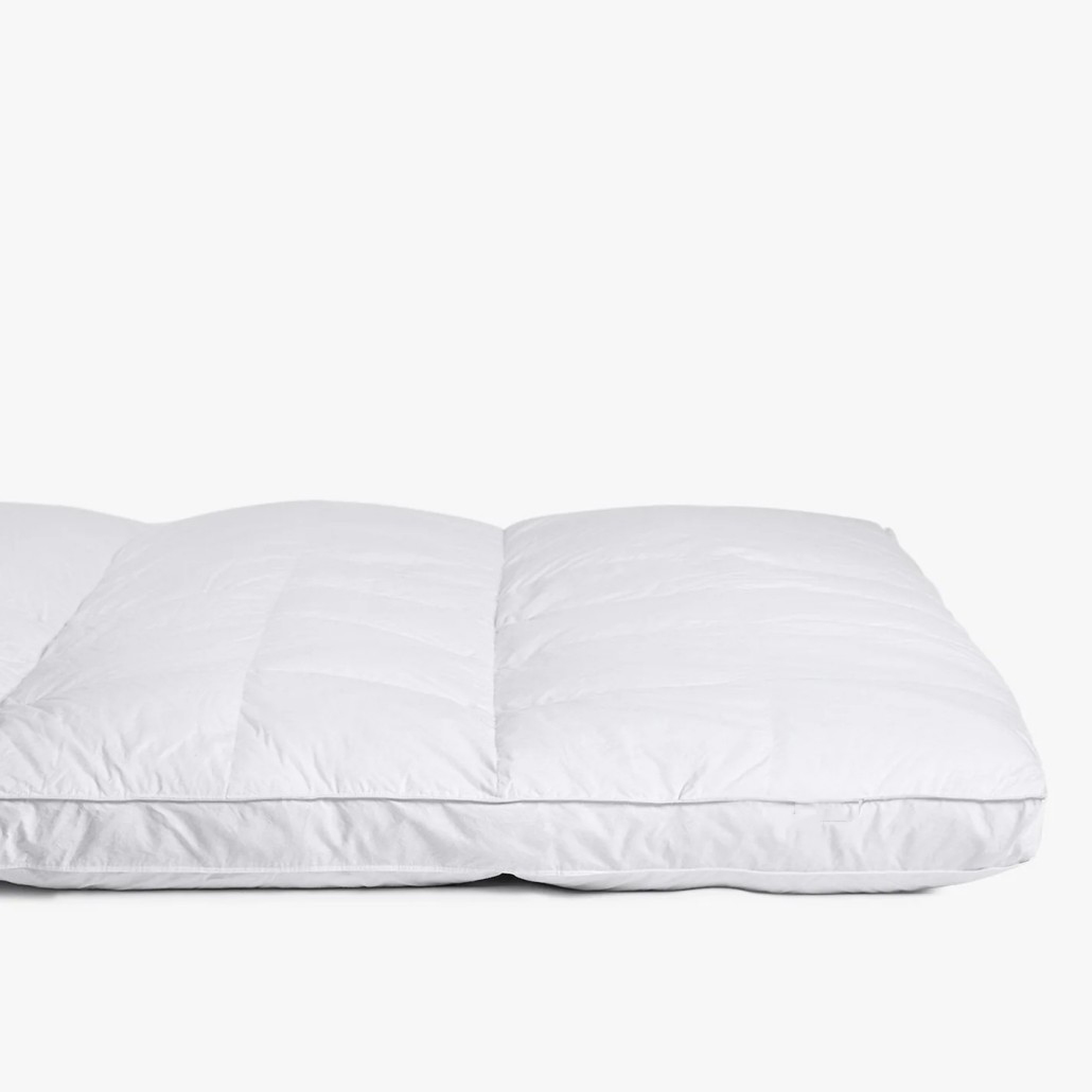 Like sinking into a marshmallow-stuffed cloud each night. Our 750 fill power feather bed adds three inches of luxury to your mattress. Its dual-chamber design provides two layers of down and feathers for snug, enveloping comfort and uses three-dimensional baffle box stitching to keep the fill evenly distributed. Finished with a soft 100% cotton sateen shell.