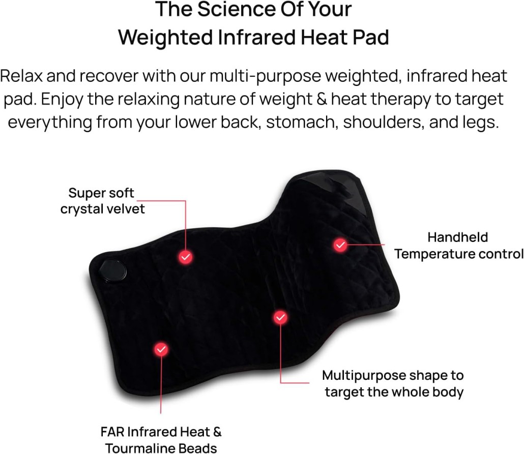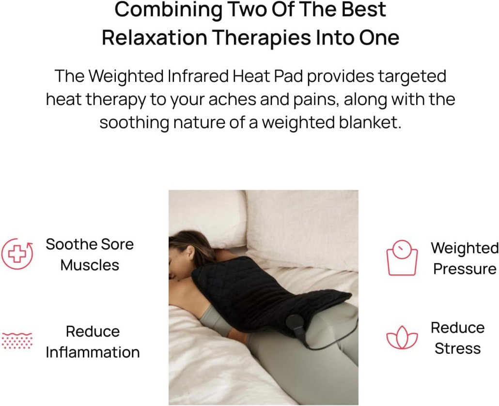 A MultiPurpose Heat Pad Designed for the Whole Body Because of infrared heats ability to penetrate the skin deeper than any other heat, it can relax your muscles and ease pain far more effectively. The end result? A more relaxed back.We’ve taken the best tech for relaxation from heat therapy and weighted blankets and combined it into your new favourite relaxation tool. Try it today and enjoy the relaxation!