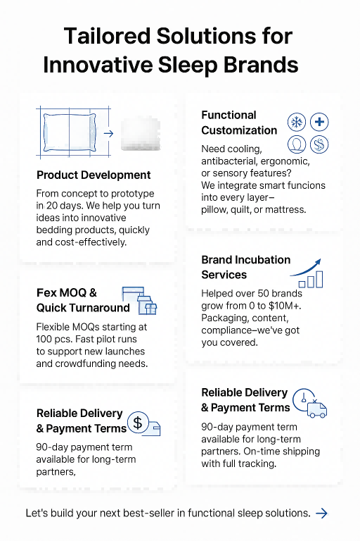 Co-create products with advanced materials like PCM, copper-infused fibers, graphene, and memory foam—fully customized for your brand vision.