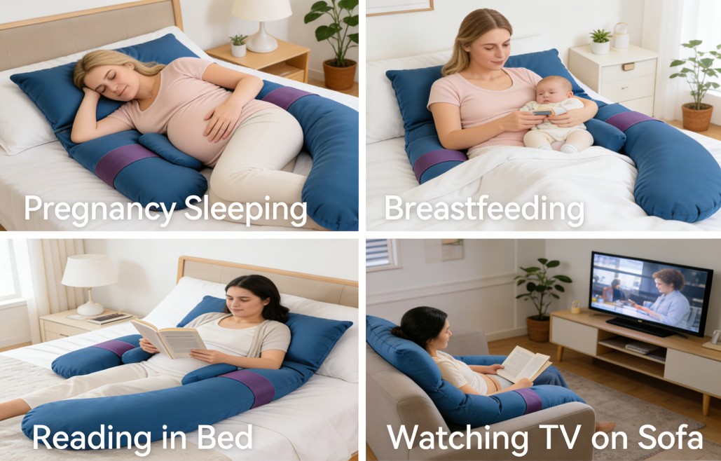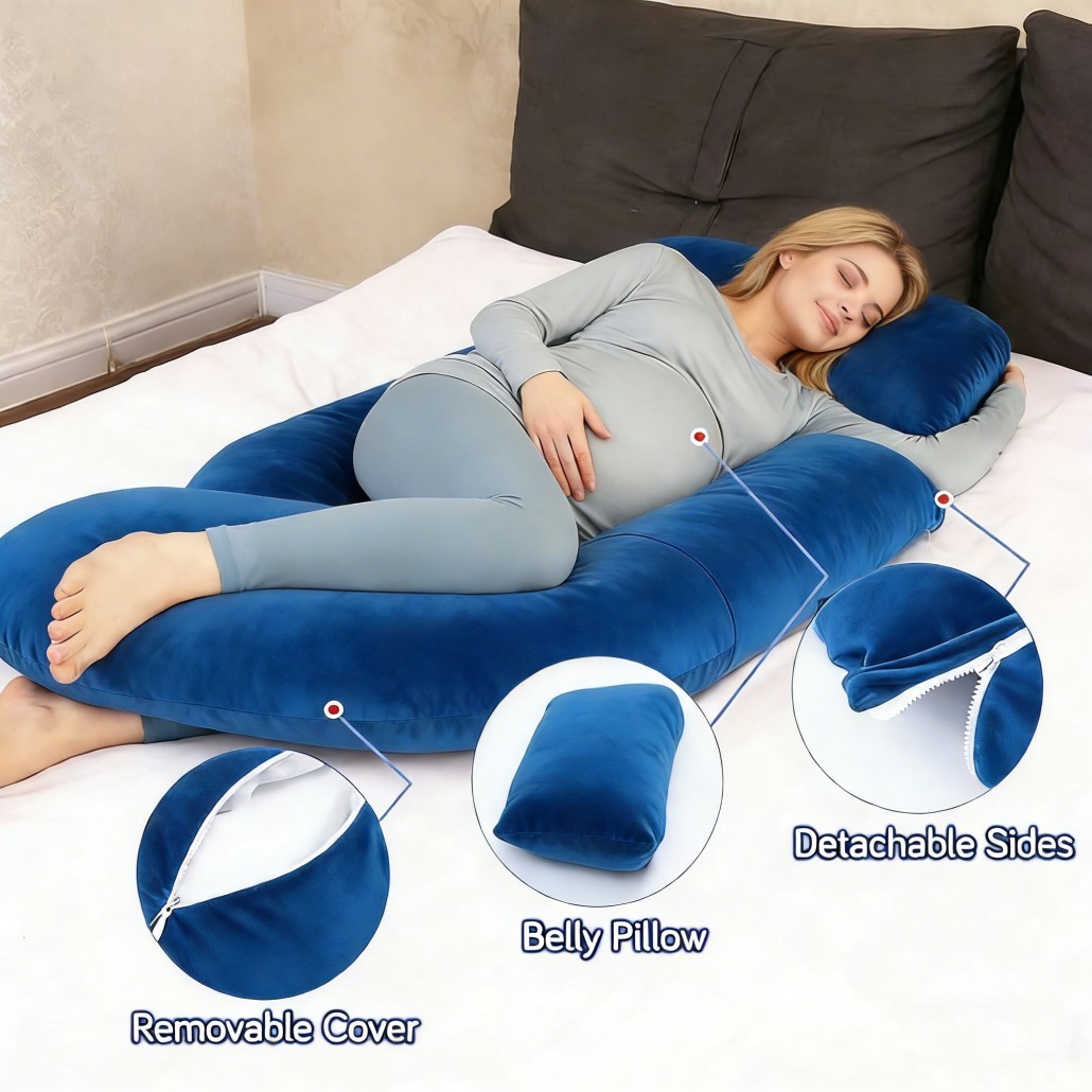 A pregnancy pillow is designed to support the body during pregnancy. It helps relieve pressure on the back, belly, hips, and legs, allowing pregnant women to sleep more comfortably and maintain a healthy side-sleeping position.