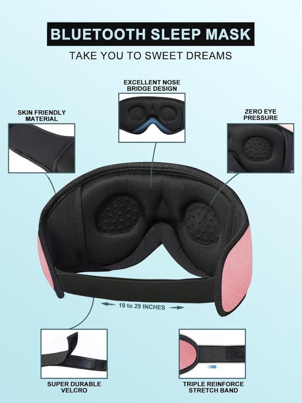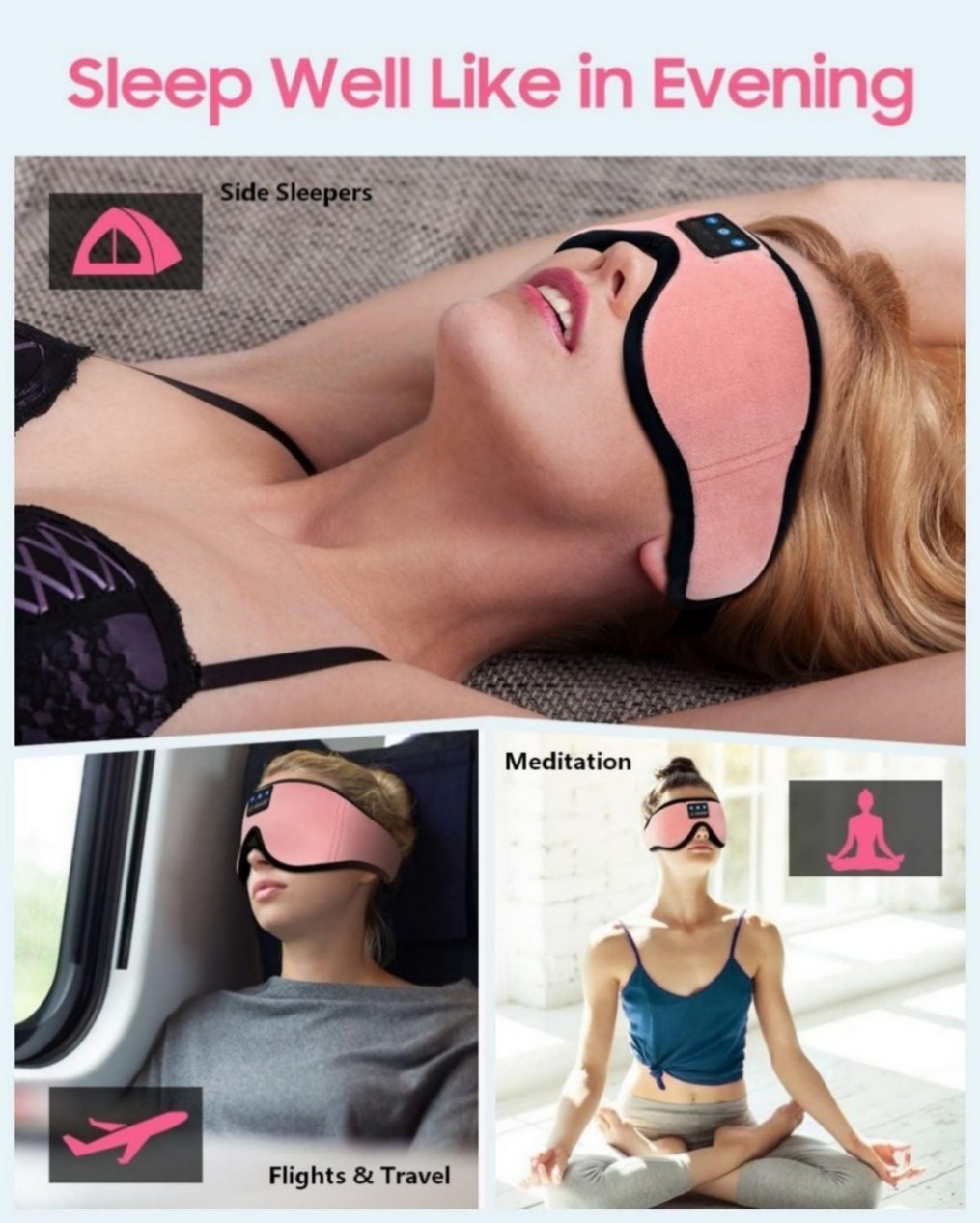 1.[Sleep Headphones & Bluetooth Sleep Mask & Sleep Eye Mask 3 in 1] Sleep mask with bluetooth headphones features a sleep mask designed with wireless speakers headset inside,the bluetooth sleep mask combines eye mask and headphones that pefect as sleep headphones.The sleep mask headphones allow you to enjoy hands free music during your sleeping time and protect you from being disturbed by your mess hair. Bluetooth eye mask is perfect for nap,insomnia, air travel, meditation and yoga
