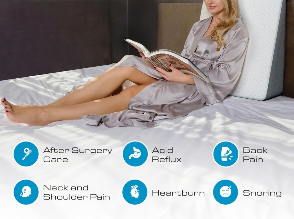 3.Ideal For Recovery In Bed: Aches and pain often robs you of a good night’s sleep. Includes: snoring, neck and back pain and post-surgery ailments. The best wedge pillow for sleeping. Wedge pillow for acid reflux relief.