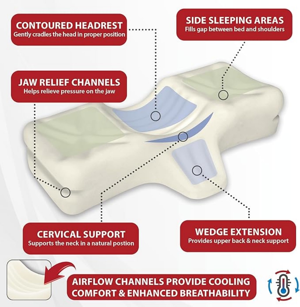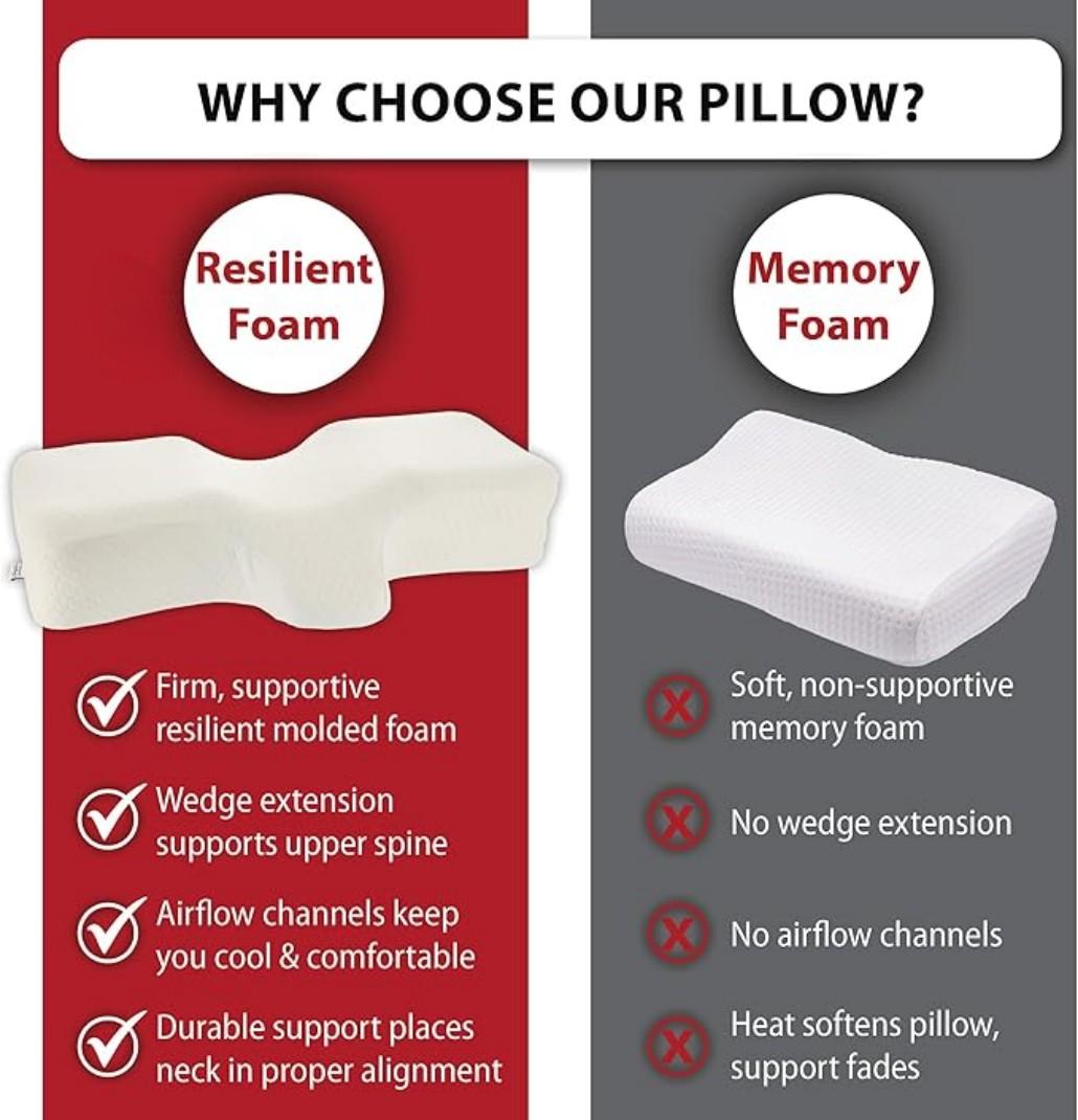 Ergonomic cervical pillow designed for side and back sleepers, providing firm neck support and proper spinal alignment. Made with high-density molded foam and a breathable removable cover, it helps relieve neck and shoulder pressure for a more comfortable and restful sleep.