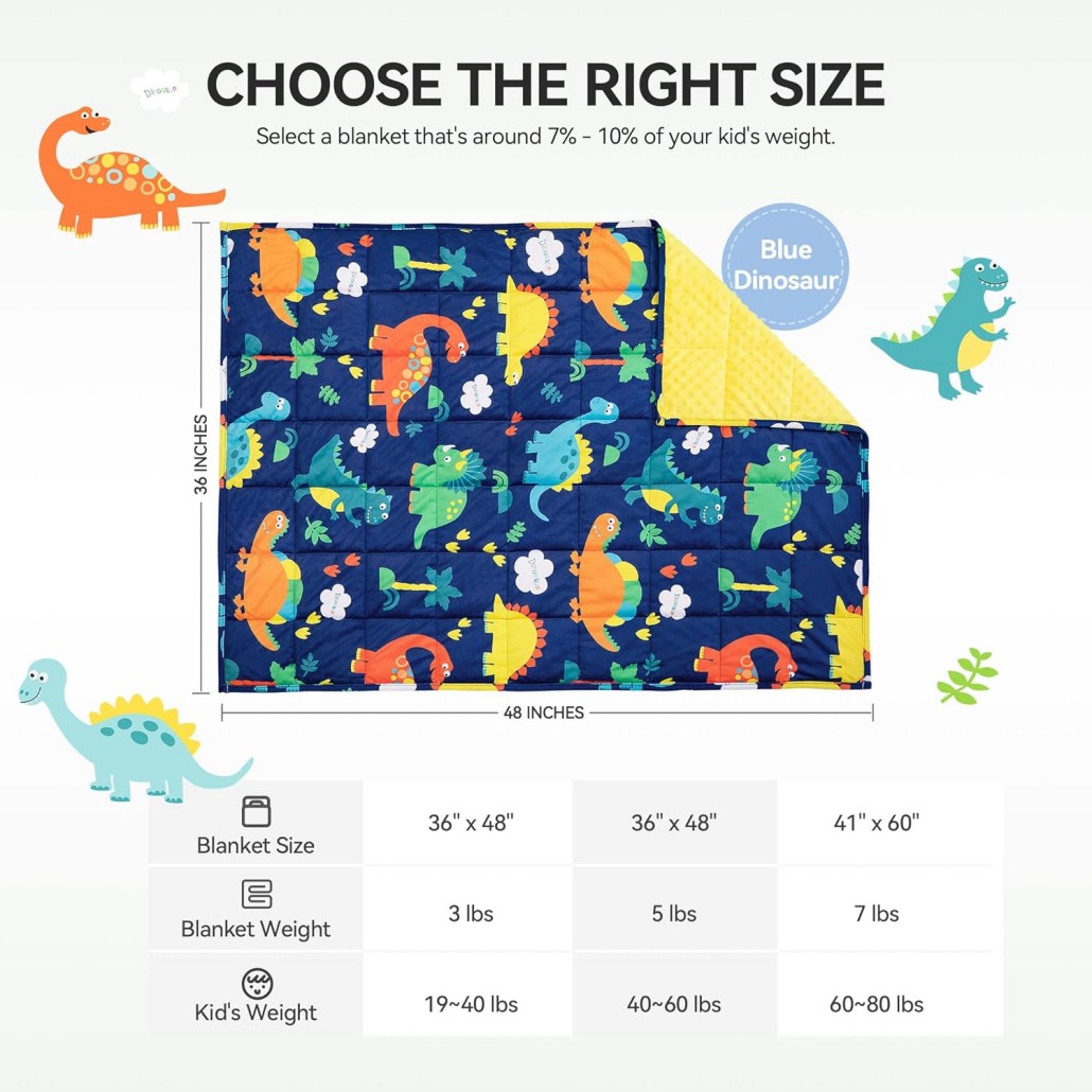 4.Versatile Options: These weighted blankets are available in 3 colors and patterns to to suit them preferences and needs. Choose a blanket that's around 7% - 10% of the weight. These 3lbs, 5lbs (36" x 48"), and 7lbs (41" x 60") blankets are perfect for 19lbs - 40lbs, 40lbs - 60lbs, 60lbs- 80lbs people