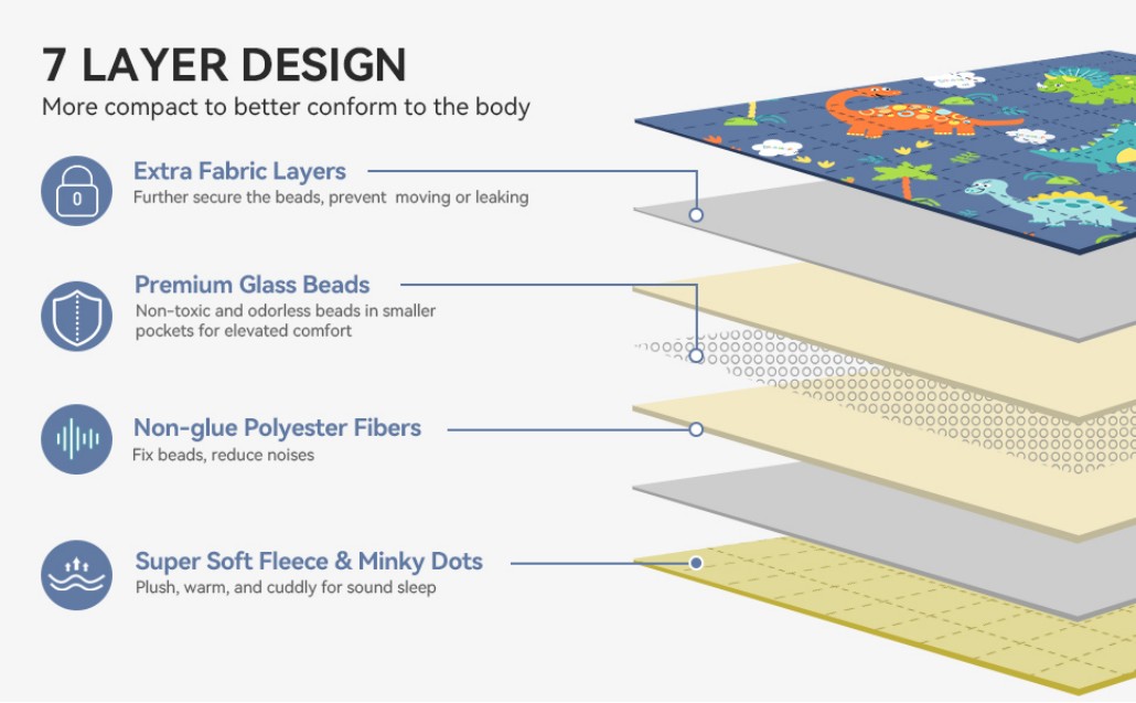 Our Kids Weighted Blanket is specially designed to provide gentle, even pressure that helps children feel calm and secure. Crafted with ultra-soft, breathable materials like microfiber and plush minky, it’s perfect for bedtime, nap time, or quiet time. The evenly distributed glass beads simulate a comforting hug, which may help improve sleep quality and reduce anxiety or restlessness. Ideal for children with sensory needs or trouble falling asleep. Available in multiple sizes, fun patterns, and child-safe designs. Machine washable and OEKO-TEX certified for safety and peace of mind.