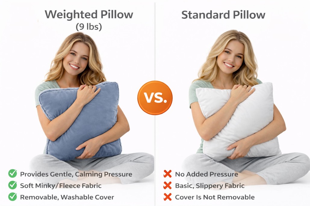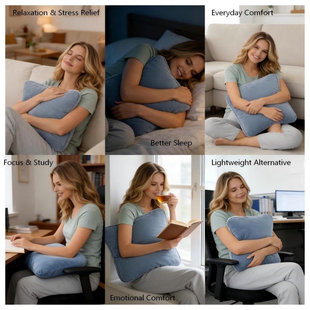 Unlike bulky weighted blankets, this lightweight and portable comfort pillow is easy to move and adjust wherever you need it—whether on the couch, in bed, or at your desk. Designed for both adults and kids, it offers a practical and comforting solution for anyone seeking calm, focus, and relaxation.