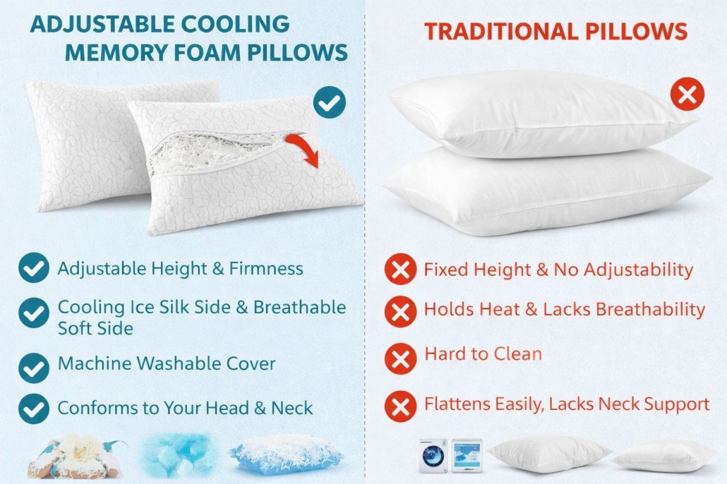 Night Sleep:Enjoy deep sleep all night with pillows that balance softness and neck alignment. Choose from memory foam, cooling gel, or adjustable fill to fit your unique sleeping style.