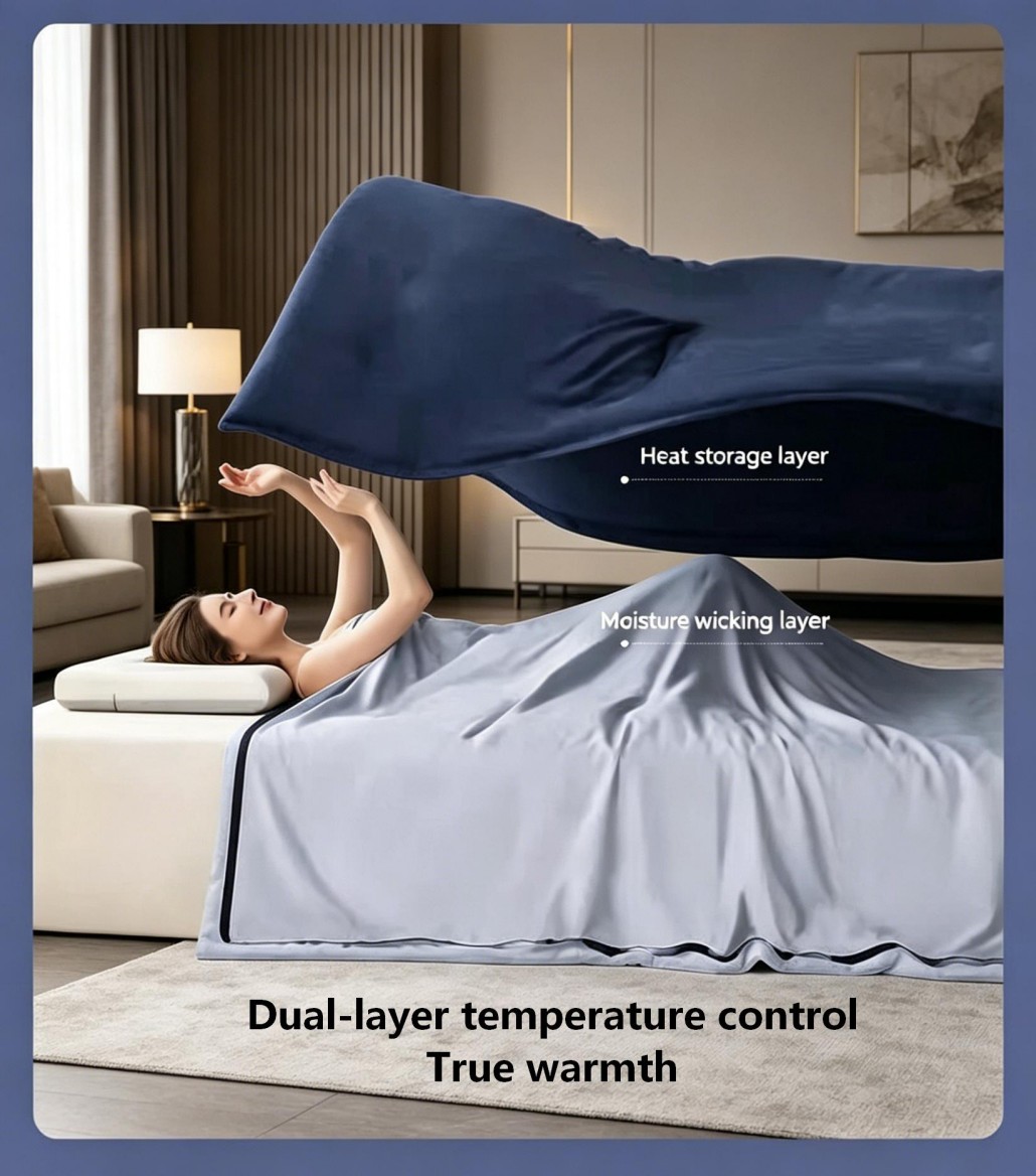 Unlike regular comforters that trap heat and moisture, this innovative design features a dual-layer system that works with your body throughout the night. The top layer gently retains warmth, while the bottom layer releases excess heat and moisture — creating a dry, breathable sleep environment.