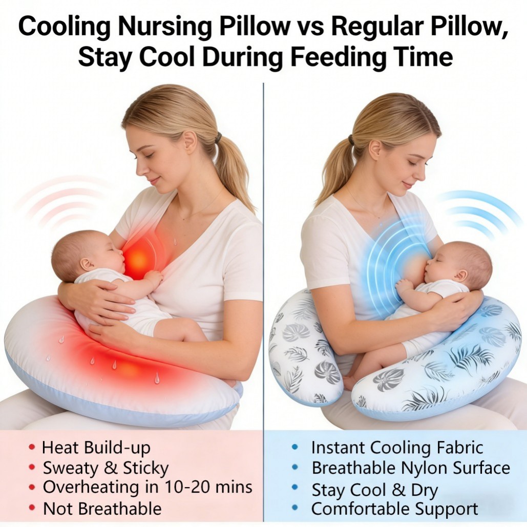 The pillow features a detachable cover that is easy to remove and clean, ensuring hygiene and long-term durability. Lightweight and portable, it can be conveniently used at home, on the sofa, or during travel. The breathable and smooth-touch fabric provides a refreshing sensation, avoiding overheating and discomfort often experienced with regular nursing pillows. Ideal for short 10–20 minute feeding or holding periods, this pillow keeps both mom and baby cool, relaxed, and supported. With its thoughtful combination of comfort, cooling technology, and ergonomic design, it becomes an essential companion for daily baby care, postpartum recovery, and a more enjoyable bonding experience.