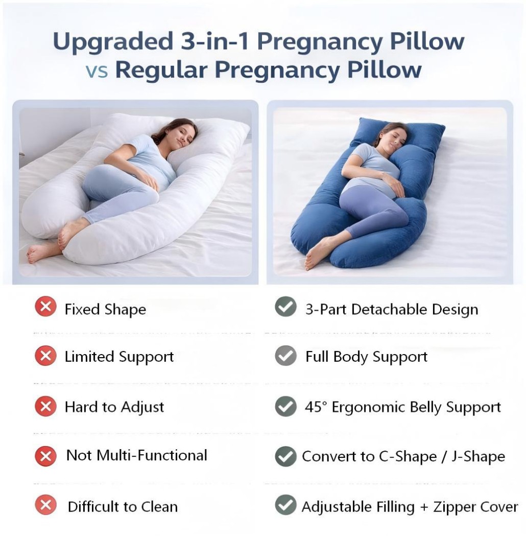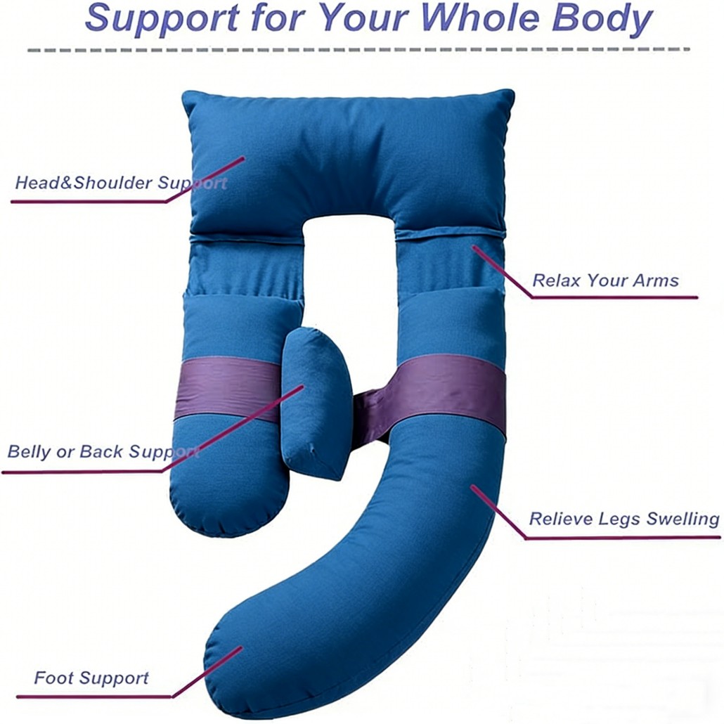 A pregnancy pillow is designed to support the body during pregnancy. It helps relieve pressure on the back, belly, hips, and legs, allowing pregnant women to sleep more comfortably and maintain a healthy side-sleeping position.