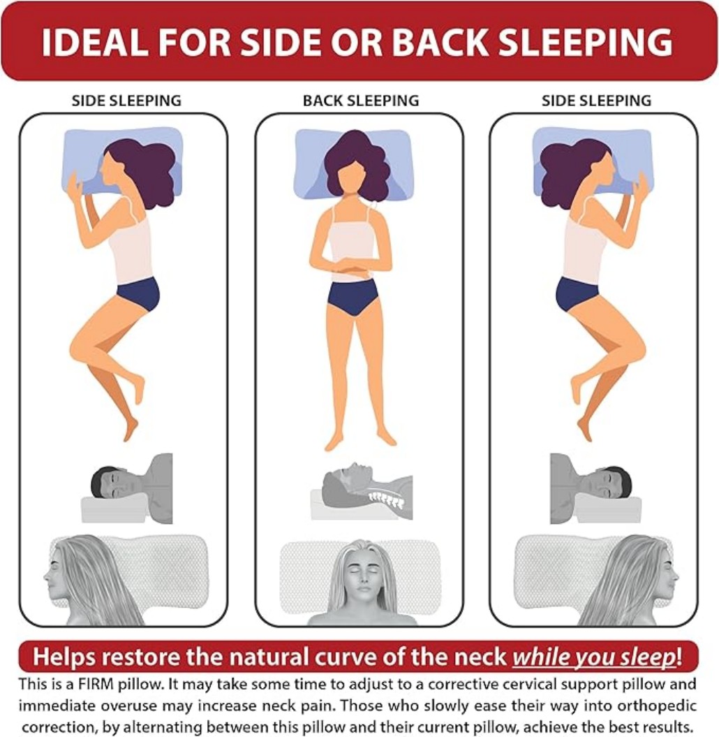Ergonomic cervical pillow designed for side and back sleepers, providing firm neck support and proper spinal alignment. Made with high-density molded foam and a breathable removable cover, it helps relieve neck and shoulder pressure for a more comfortable and restful sleep.